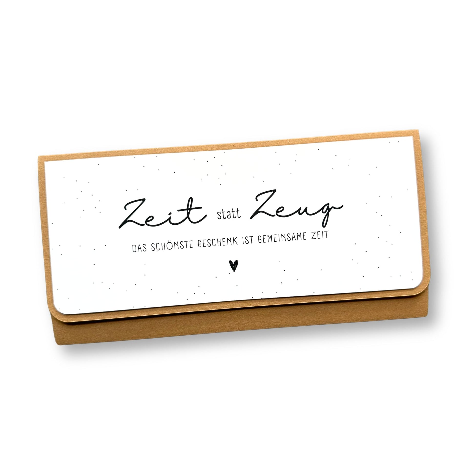 • Botschaft mit Herz: „Zeit statt Zeug - Das schönste Geschenk ist gemeinsame Zeit“ auf der Vorderseite