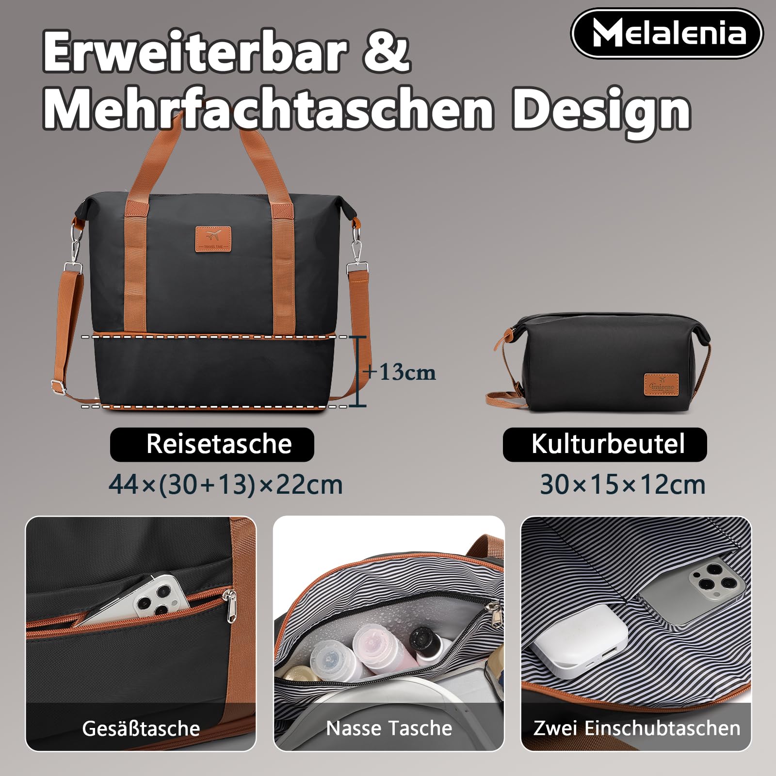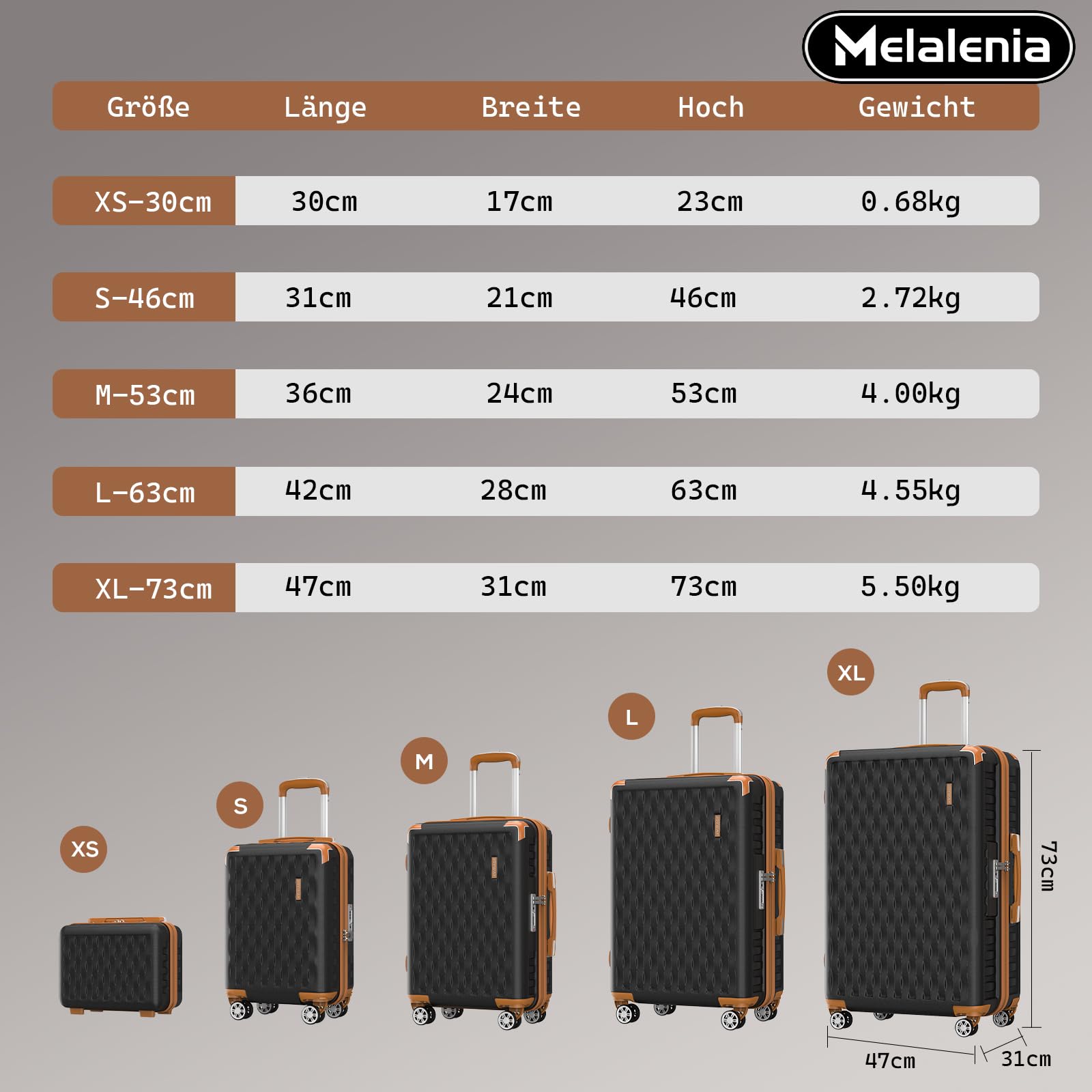 • Set contents: cosmetic case (30cm), cabin suitcase (46cm), hand luggage (53cm), medium suitcase (63cm), large suitcase (73cm), expandable travel bag, toiletry bag