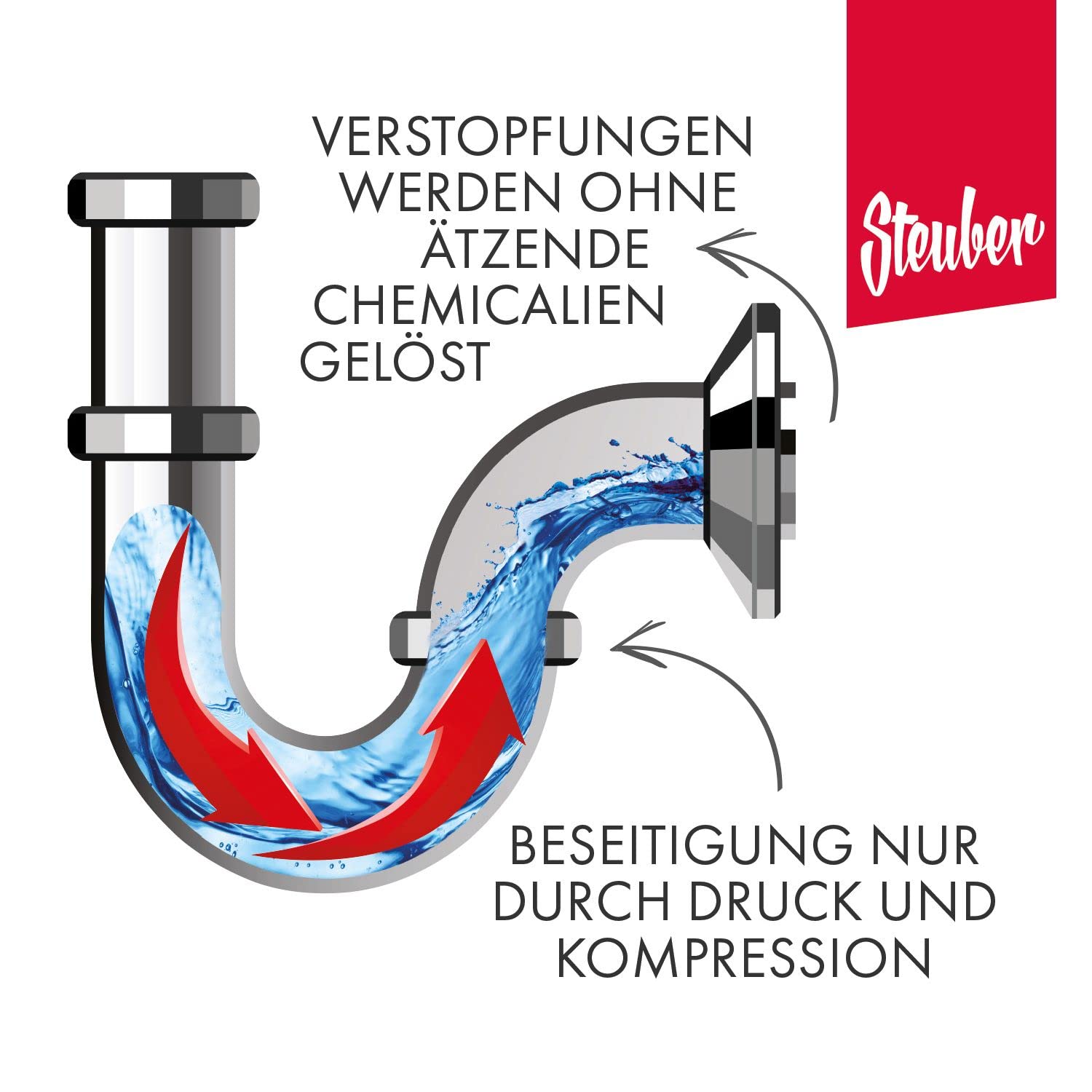 The Steuber drain cleaner clears blockages in seconds – without the use of aggressive cleaning agents . Cleaning occurs exclusively through pressure and compression , making it environmentally friendly and safe for pipes and lines.