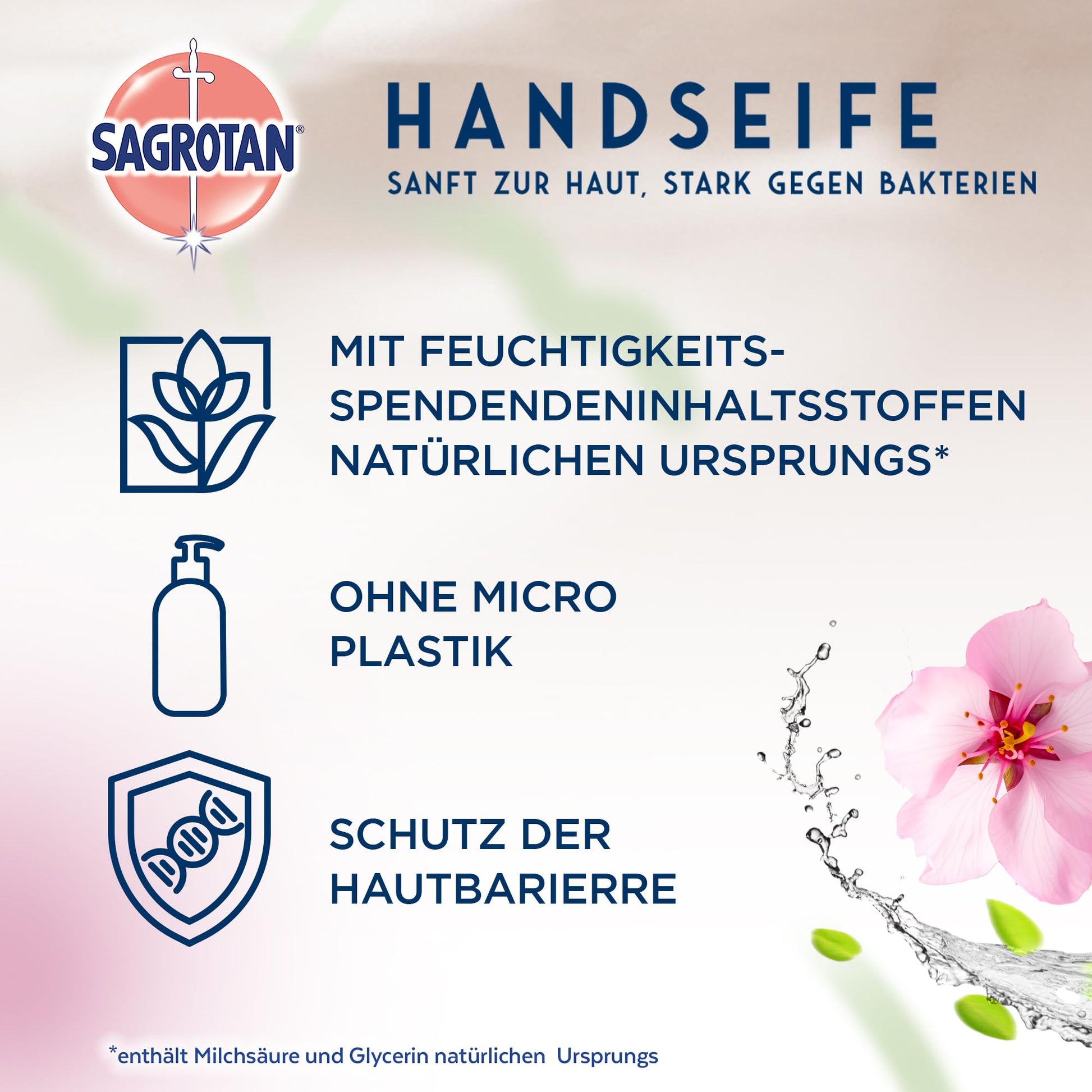 Sagrotan Invigorating and Floral Hand Soap gently cleanses and cares for your skin with a moisturizing formula containing lactic acid and glycerin . This liquid soap ensures hygienic cleanliness and leaves skin feeling soft and smooth. The fresh, fruity scent of Japanese cherry blossom and apple offers a pleasant fragrance experience and is especially suitable for sensitive skin. Dermatologically tested, the soap guarantees excellent skin compatibility.