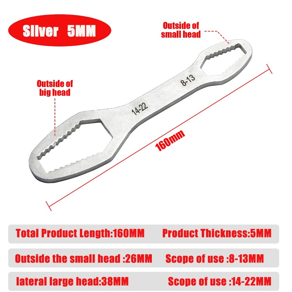 La longueur du produit varie entre 145 mm et 160 mm, l'épaisseur entre 3,5 mm et 5 mm, et il peut desserrer les vis de 3 mm à 22 mm et de 8 mm à 17 mm, respectivement.