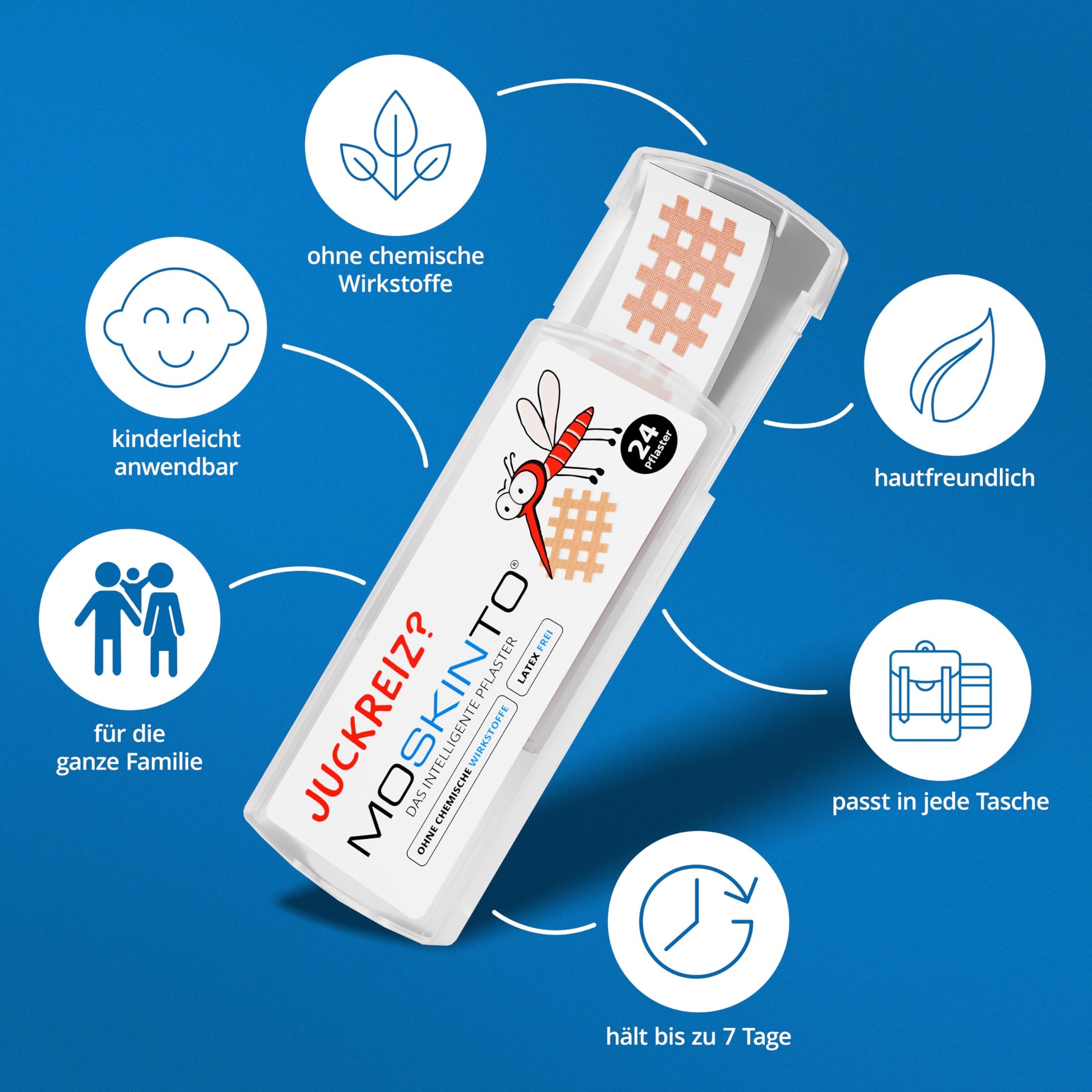 Der Mückenstich ist da - aber Jucken, Kratzen oder Salbenchaos müssen nicht sein. Die MOSKINTO Pflaster bieten eine praktische und völlig wirkstofffreie Lösung zur natürlichen Linderung nach Insektenstichen. Einfach aufkleben - fertig! Ideal für Kinder, Erwachsene und unterwegs.