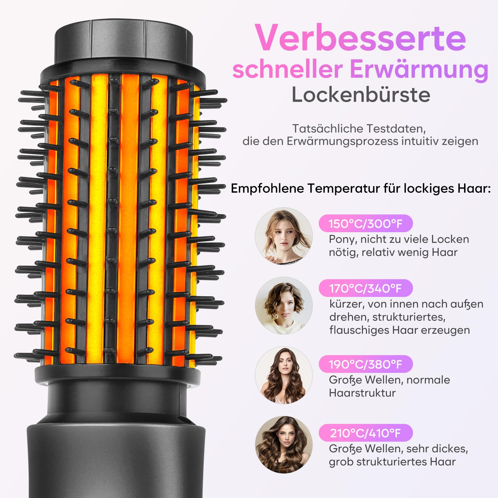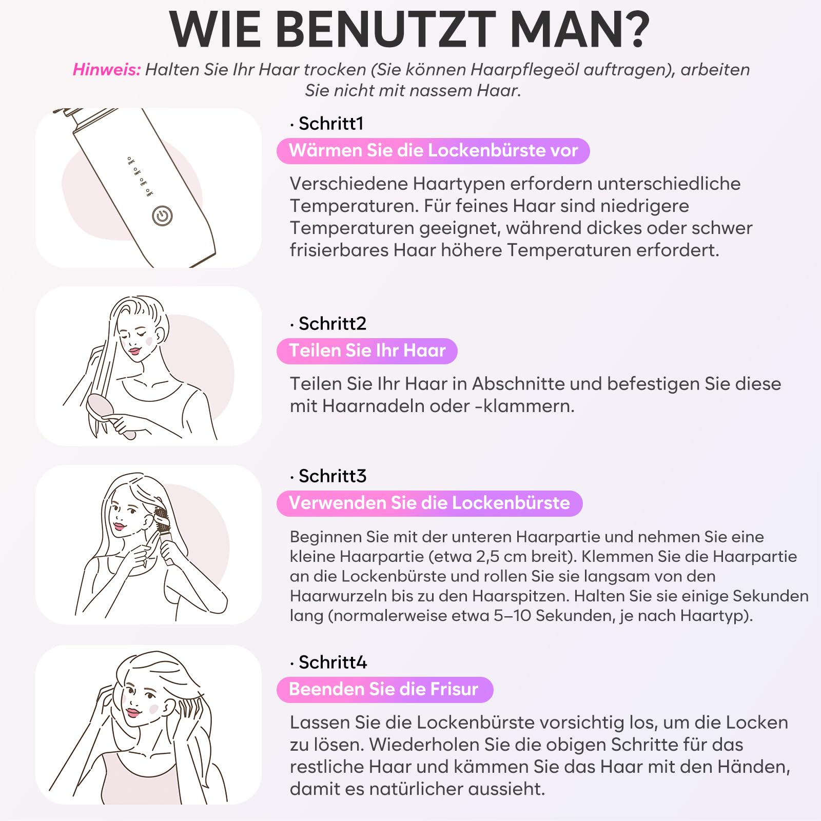 - Vier einstellbare Temperaturstufen für unterschiedliche Haartypen