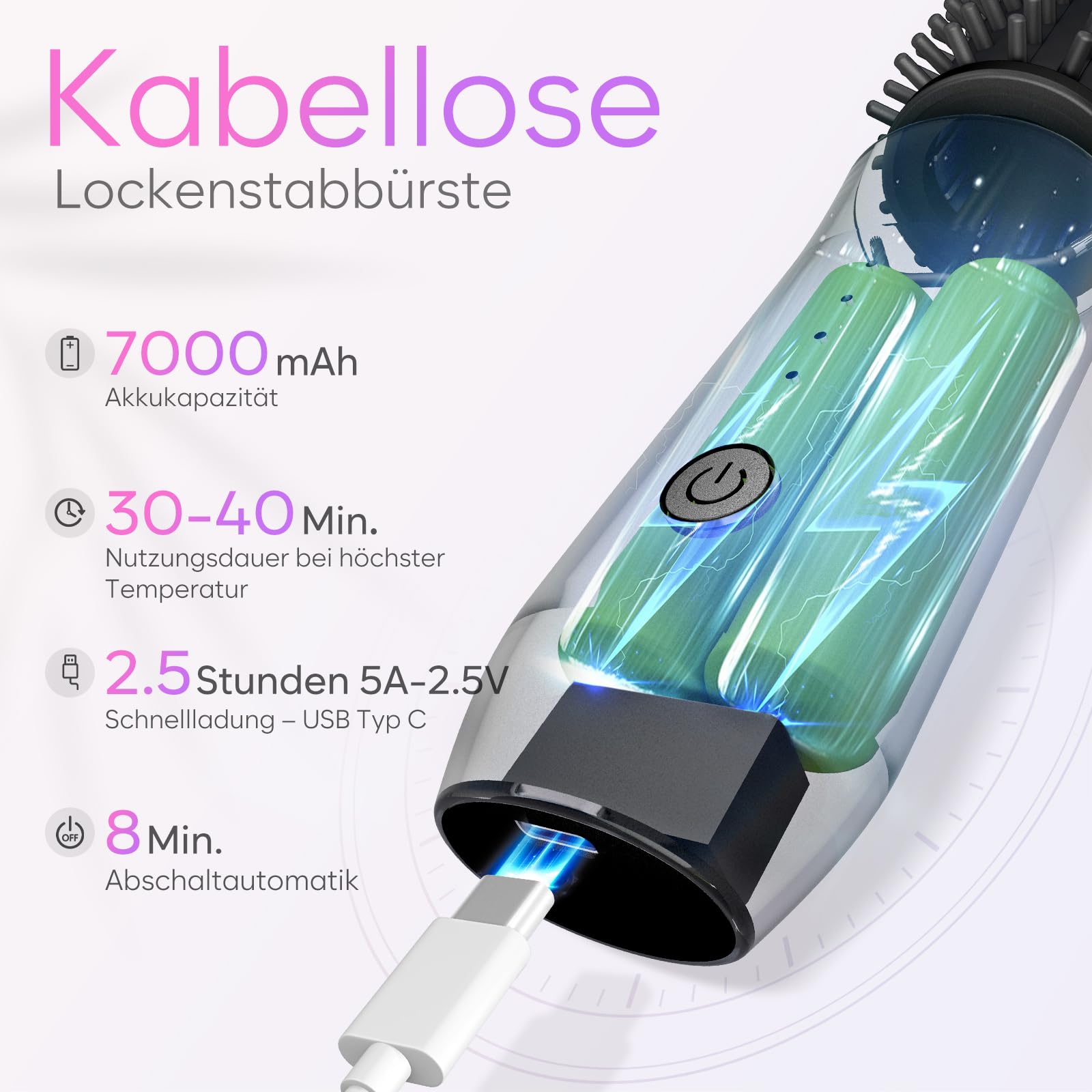 Wireless Reise-Lockenstab-Minibürste für Frauen (7000mAh): USB-Aufladbar mit Negativen Ionen