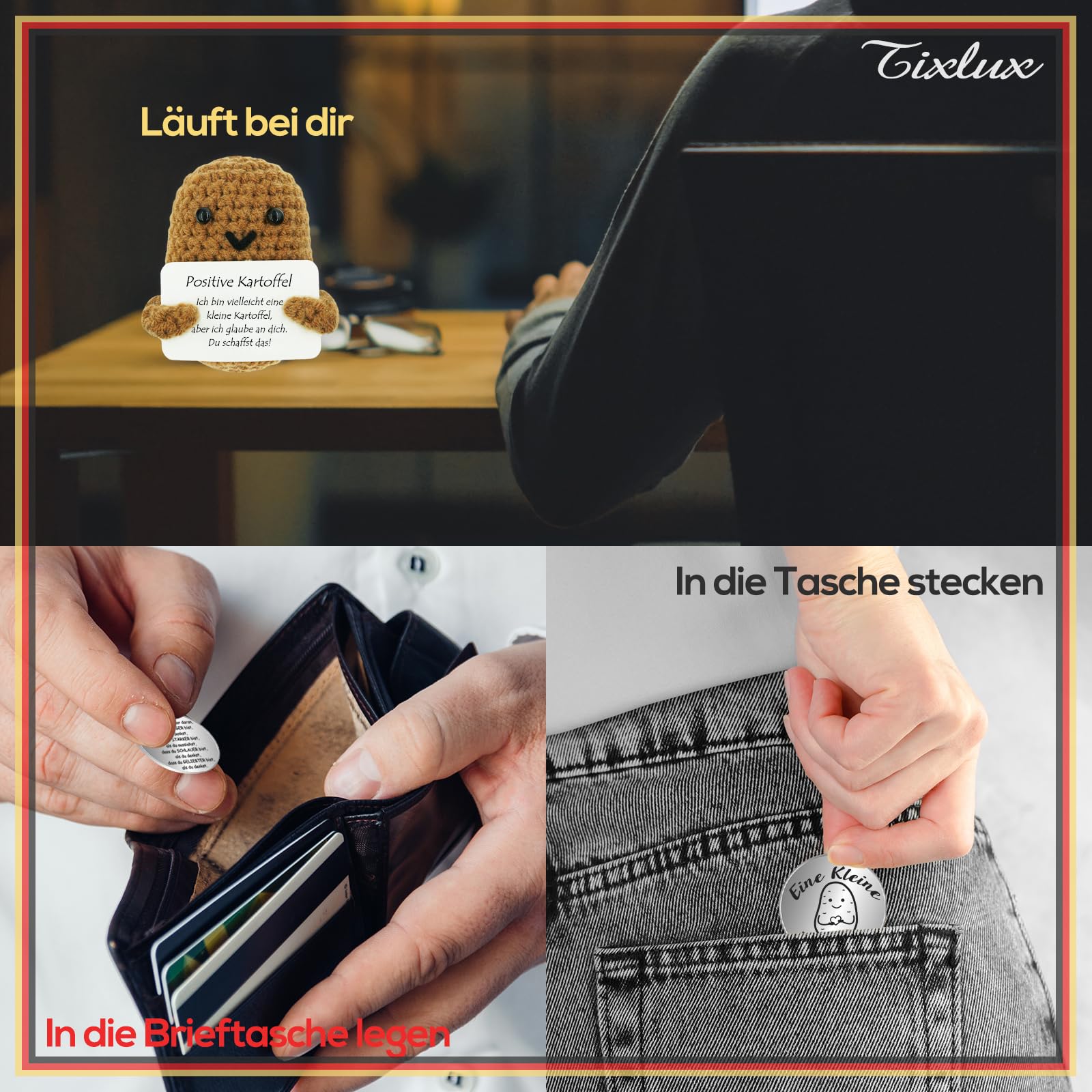Die Tixlux Positive Kartoffel ist ein liebevoll handgefertigtes Mini-Set aus einer gestrickten Kartoffelpuppe und einem silberfarbenen mit eingravierten aufmunternden Worten. Ideal zum Verschenken - ob an Familie, Freunde oder Kollegen - sorgt dieses kleine Set für ein Lächeln und gibt Mut in schwierigen Momenten. Durch die kompakte Größe passt es in jede Tasche und ist ein treuer Begleiter für unterwegs.