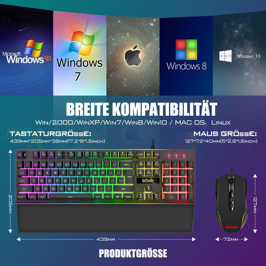 • RedThunder K10 Gaming Tastatur und Maus Set, QWERTZ DE-Layout, Metallplatte und Handballenauflager,RGB-Hintergrundbeleuchtung und 7D mit Ergonomische für PC Gamer(Schwarz)