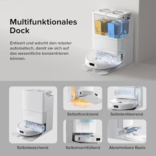Mit 200 U/min Rotationsgeschwindigkeit und einer 30-stufigen Wasserregulierung sorgt der Roboter für ein besonders gründliches Wischen. Dank der vollautomatischen Reinigungsstation (Selbstentleerung, Selbstwaschung, Selbsttrocknung, Selbstnachfüllung) bleibt Ihnen mehr Zeit für die wichtigen Dinge im Leben.
