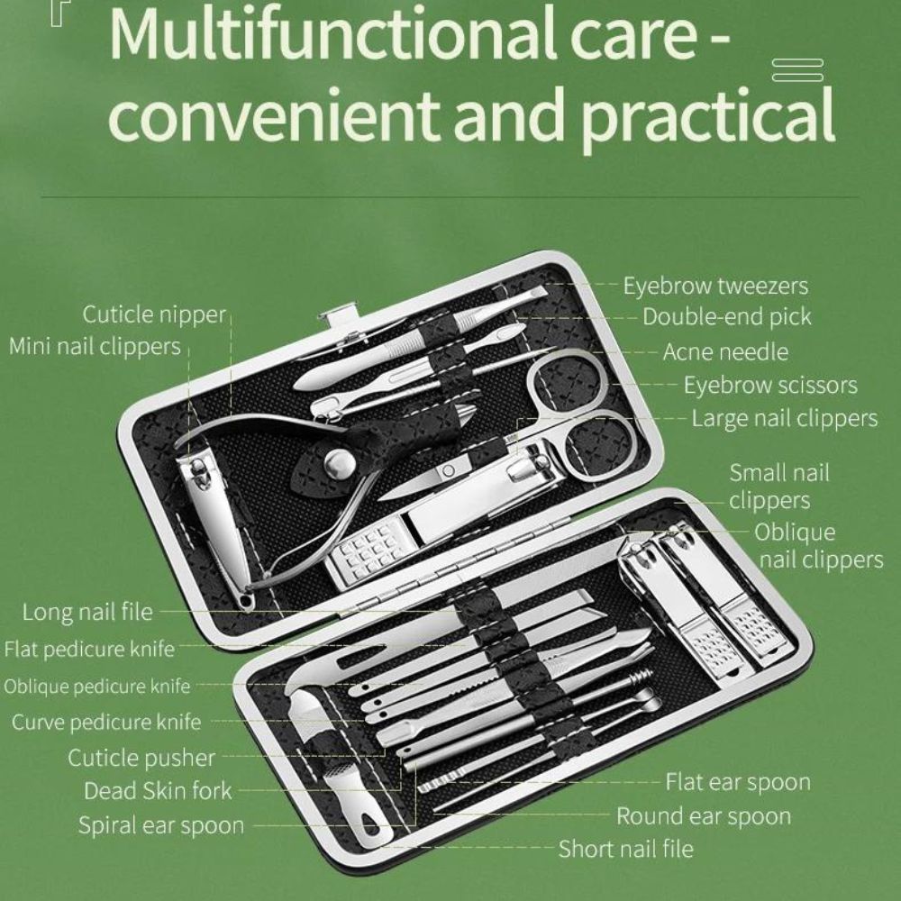 Ensemble de manucure de voyage en acier inoxydable 19 pièces | Kit de soins professionnels avec étui premium - polyvalent