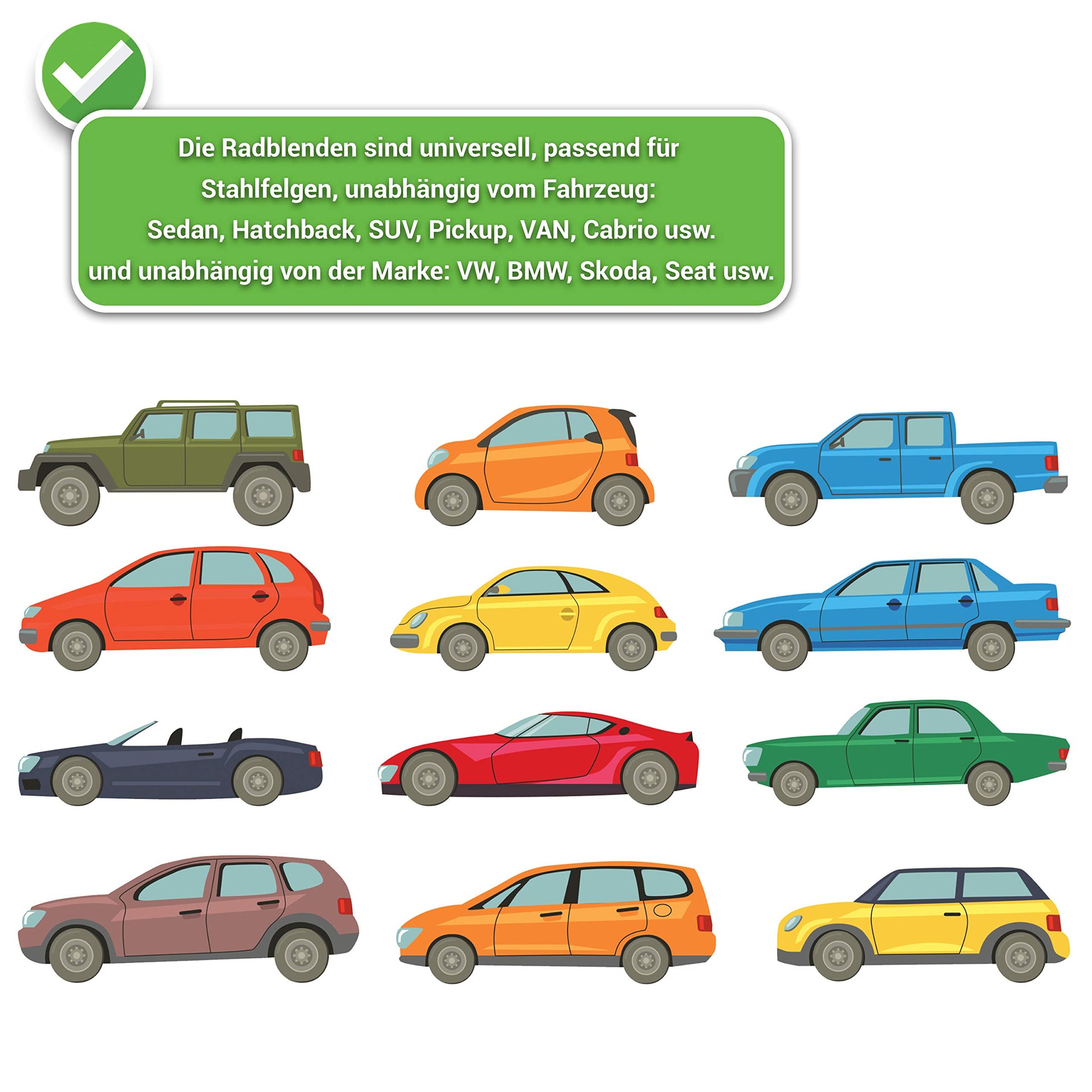 Universelle Passform: Geeignet für alle gängigen 15 Zoll Stahlfelgen - einfache Größenbestimmung über Reifenkennzeichnung (z. B. R15).
