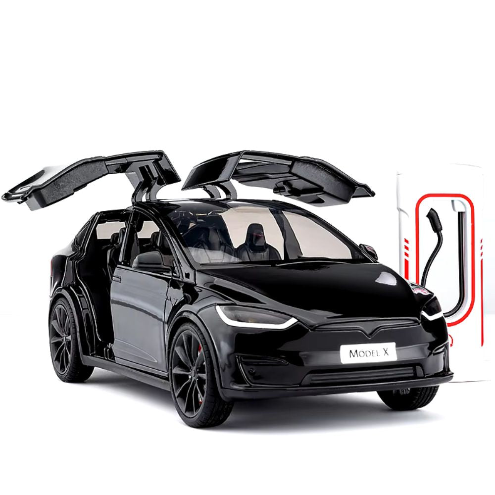 Voiture jouet Tesla Model X (1:24) avec lumières et son | Avec station de recharge : cadeau de collection (noir)