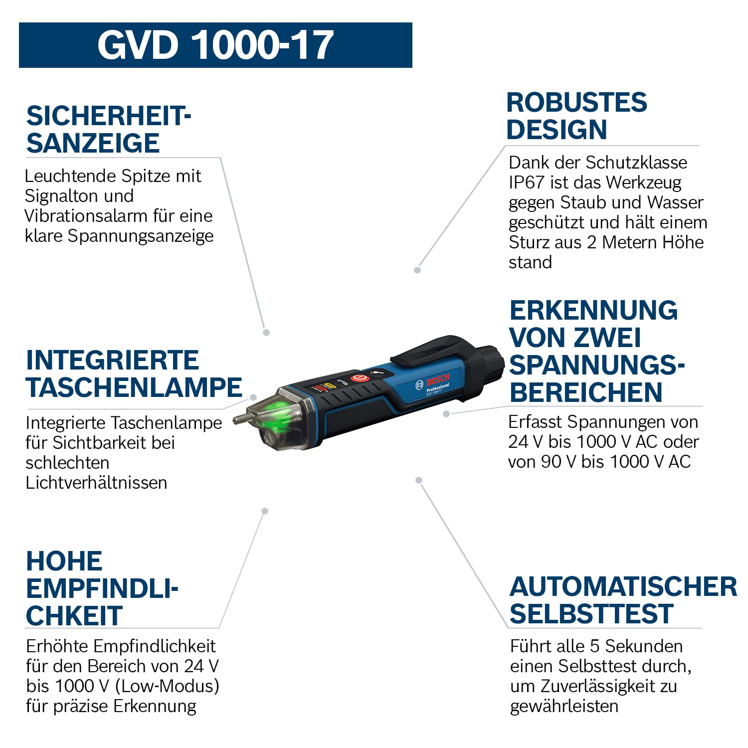 Der Bosch GVD 1000-17 ist ein professioneller, kontaktloser Spannungsprüfer für den sicheren Nachweis von Wechselspannung im Niederspannungs- und Hochvoltbereich. Ideal für den Einsatz auf der Baustelle - kompakt, wasserdicht und besonders zuverlässig.