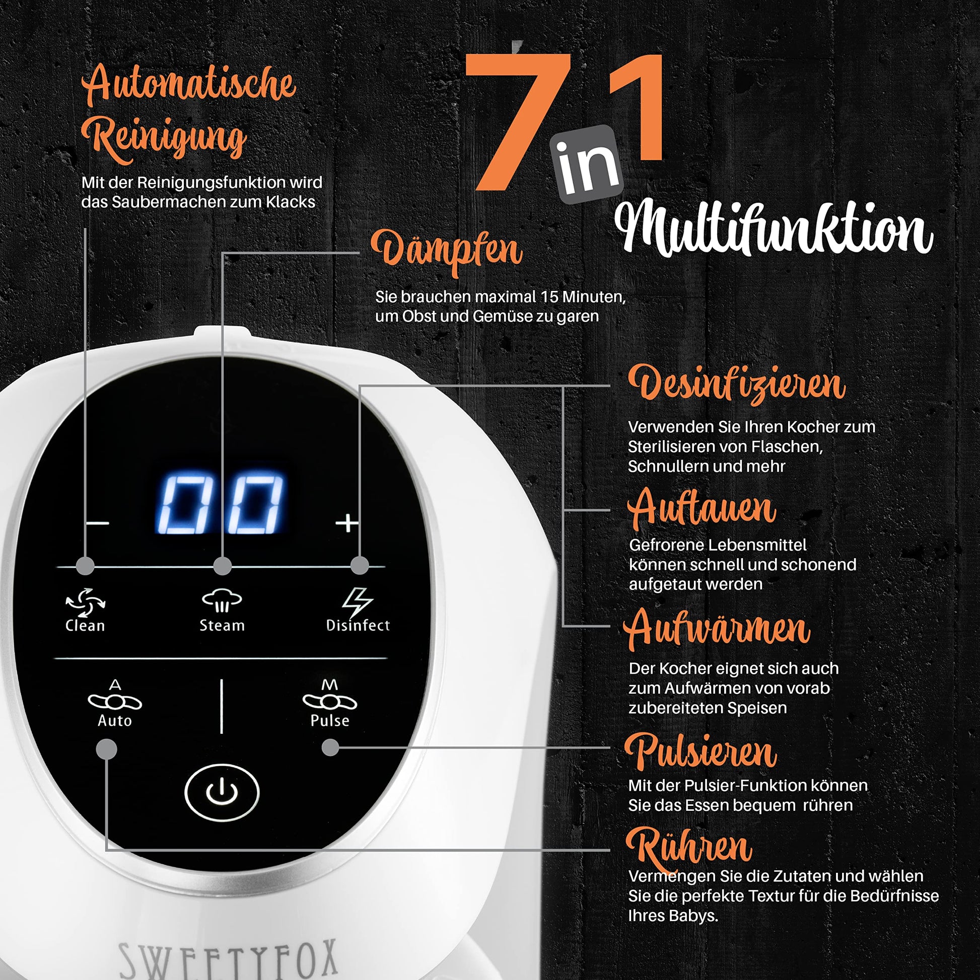 SWEETY FOX: 7-in-1 Multifunktions Babynahrungszubereiter mit automatische Reinigungsfunktion